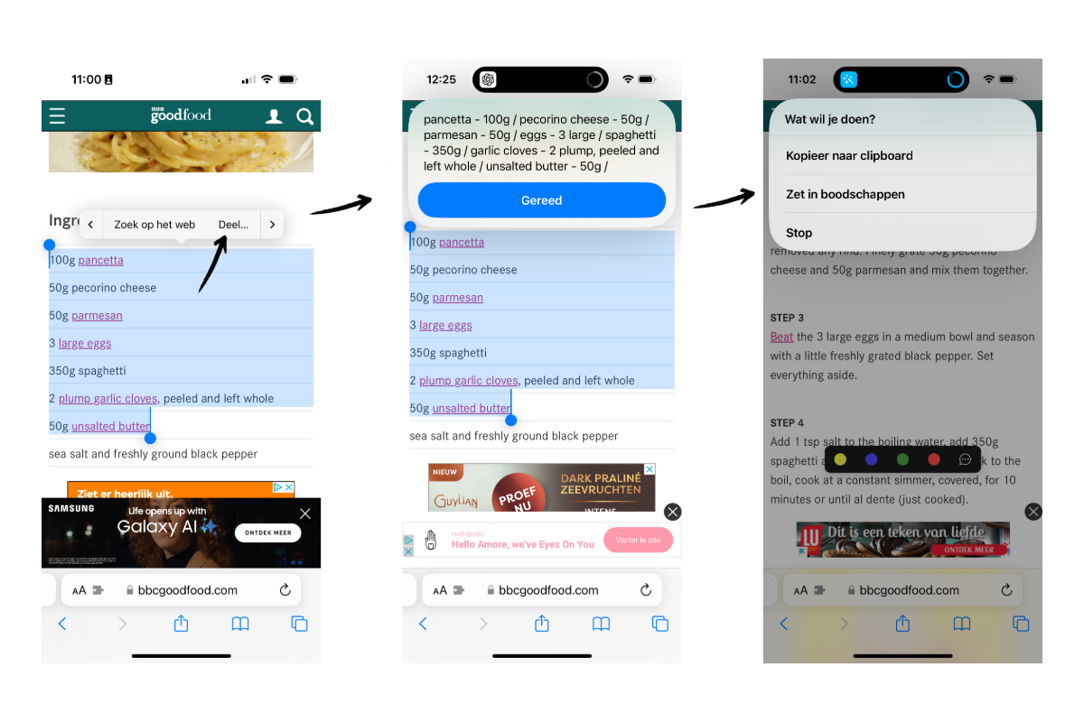 For the shortcut to work, I highlight the ingredients and hit the share dialogue.