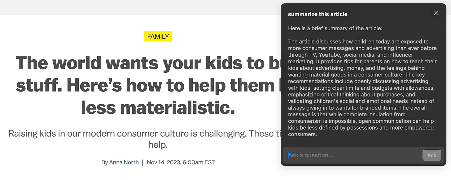 They also have a Chrome extension that works in the same way as ReaderGPT. You click on the extension and click on "summarize" to get a summary of your webpage.